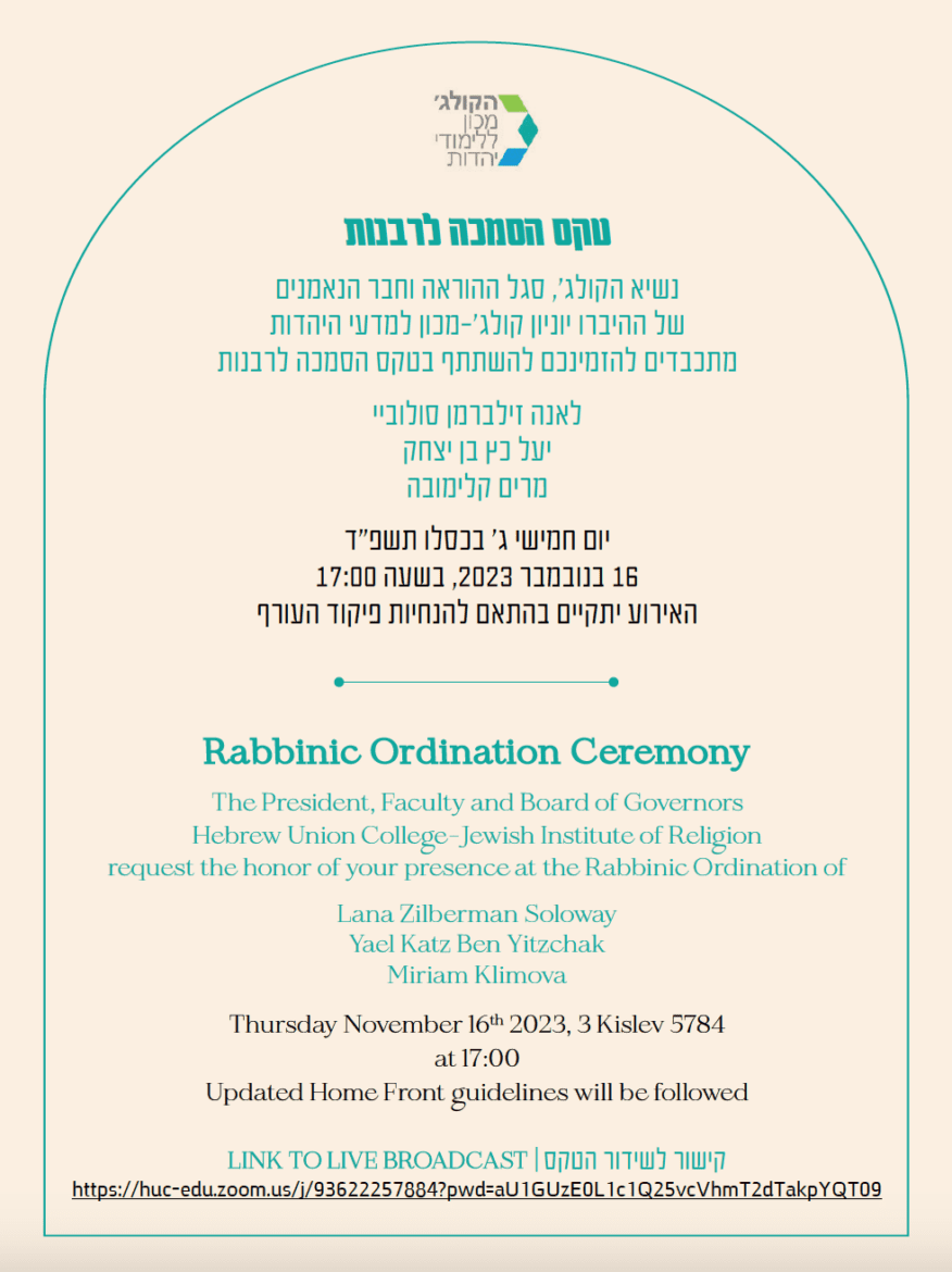 Your presence is requested at the upcoming ordination of our newest Israeli colleagues. Please support them by joining on Zoom on Thursday, November 16, 2023, 5:00 PM IST/ 10:00 AM ET/ 7:00 AM PT.